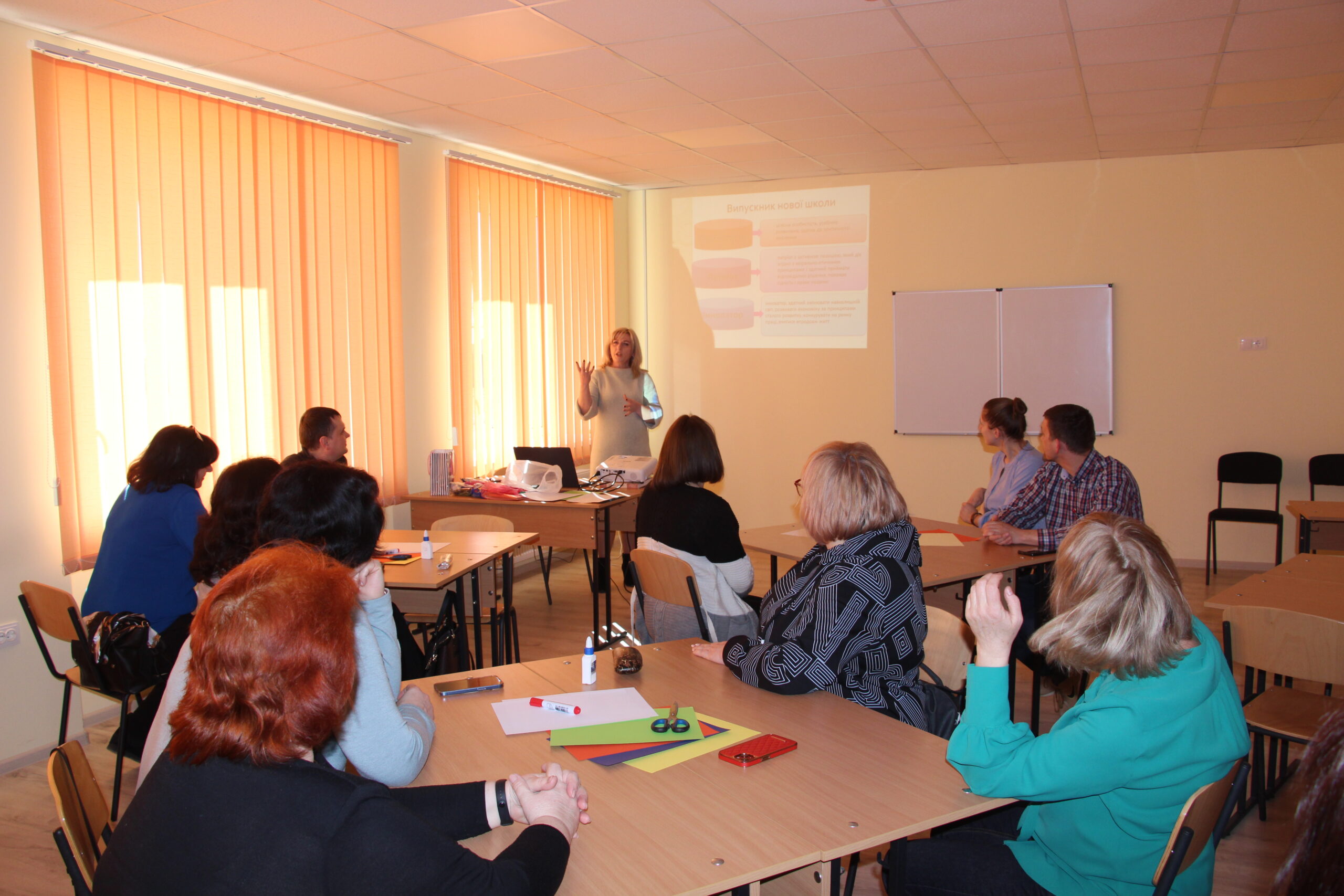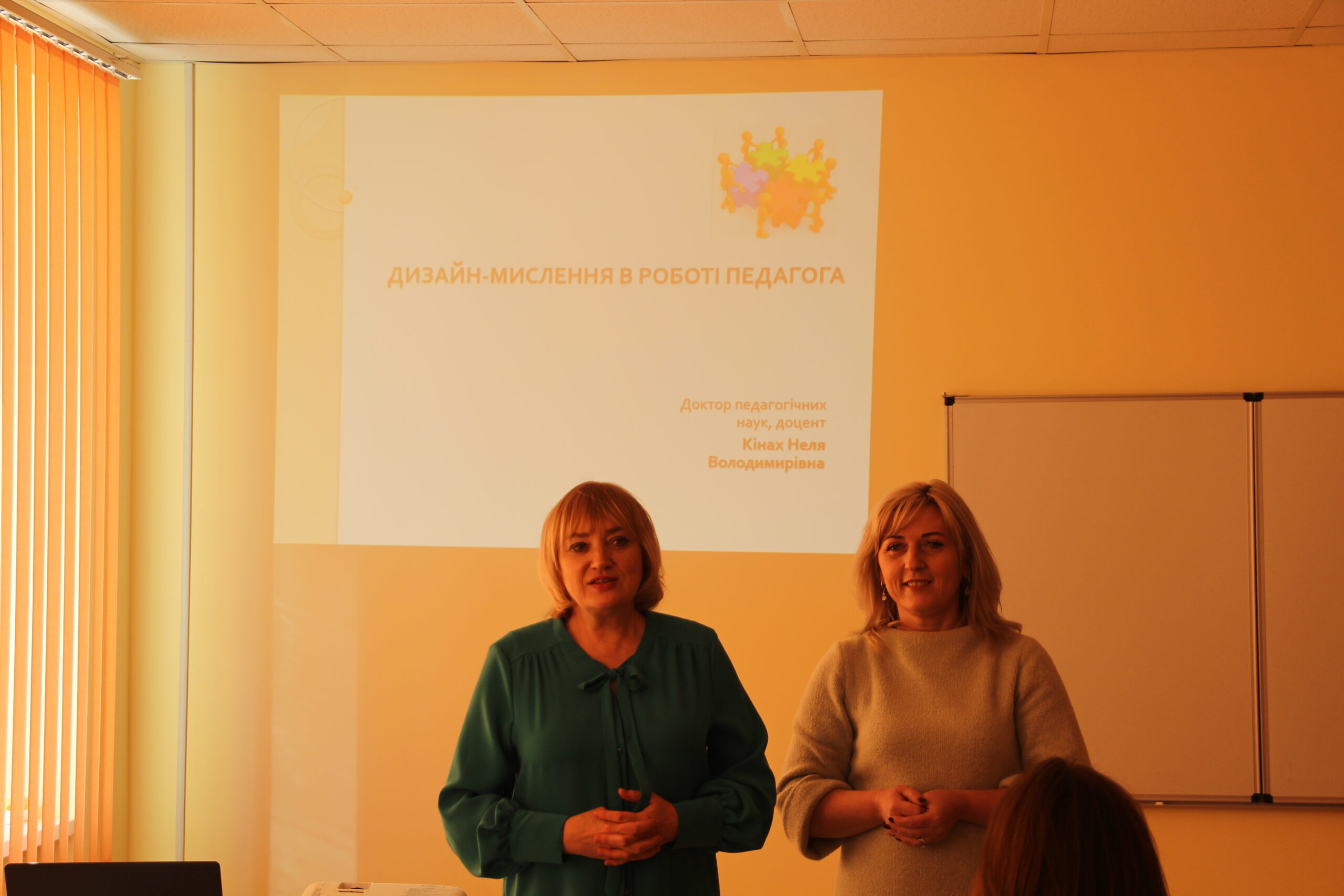 A Volinyi Pedagógustovábbképző Intézet Pedagógia és Pszichológia Tanszékének docense, a pedagógiai tudományok doktora, Nelya Kinakh dolgozta ki és vezette a tréninget. Megismertette a résztvevőket a design-gondolkodás alapvető fogalmaival, eszköztárával, hogyan lehet azt alkalmazni a szakoktatói vagy az általános pedagógiai tevékenység során. Példákon mutatta be, hogyan változtatja, alakítja színesebbé a design-gondolkodás az oktatási rendszert, gyakorlatban szemléltetett több innovatív technológiát. Az általa alkalmazott eszköztár segítségével hatékony tanulási környezetet lehet kialakítani, segít felkelteni a tanulókban az érdeklődést új dolgok megismerése iránt, ösztönöz az alkotói tevékenységre, támogatja a találékonyságot.