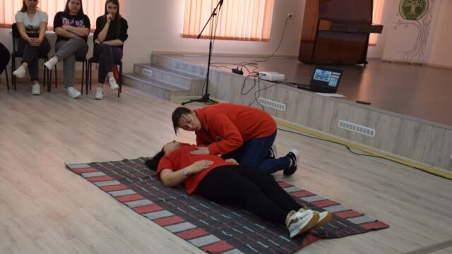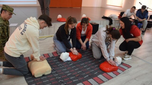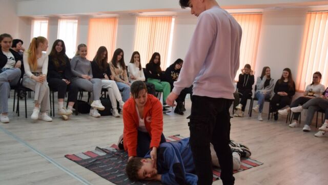Az Ukrajna védelme tantárgy oktatásának keretében a II. Rákóczi Ferenc Kárpátaljai Magyar Főiskola Szakgimnáziumának tanárai, Szedlák Katalin és Moca Andrij, nyugalmazott alezredes, docens, valamint Dankai Viktória és Kolesznik Tetjana, az Ukrán Vöröskereszt Kárpátaljai Területi Szervezetének oktatói április 11-én elsősegélynyújtási ismeretekről tartottak gyakorlati órát az 1. évfolyamos diákok számára.