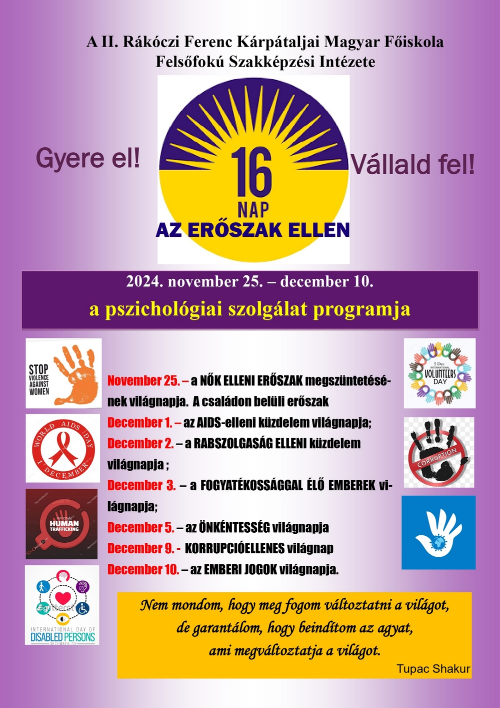 | Első esemény Dátum: 2024. 11. 25 (Hétfő) November 25. – а NŐK ELLENI ERŐSZAK megszüntetésének világnapja. A családon belüli erőszak Helyszín: A FSZI díszterme (Valamennyi évfolyam hallgatói számára) 13:40 A programsorozat megnyitója – dr. Soós Katalin, a II. RF KMF FSZI igazgatója 13:45 A program bemutatása – Gávriljuk Ilona/Gogola István 13:50 Тéma: A nők elleni erőszak felszámolásának nemzetközi napja. A családon belüli erőszak problémakörei (Videó) – Gogola István 14:20 Egy mondat az erőszak ellen – Gávriljuk Ilona 14:30 A lila szalag az erőszak elleni harc jelképe (szalagok kiosztása a résztvevőknek) |