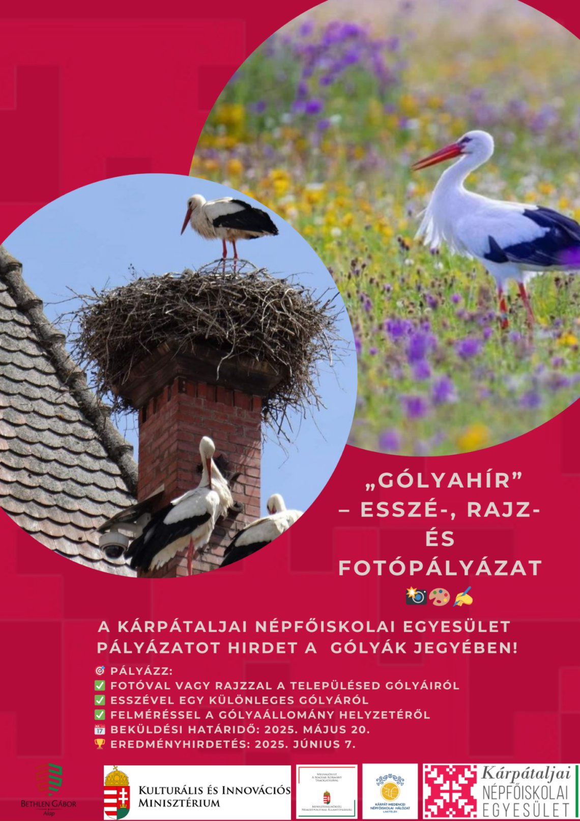 A Kárpátaljai Népfőiskolai Egyesület Gólyahír címmel esszé-, rajz- és fotópályázatot hirdet. A pályázat célja, hogy felhívja a figyelmet a magyar nép kedvelt madarára, a fehér gólyára.