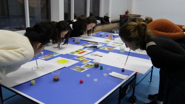 Az első állomáson kipróbálhattuk milyen kezek nélkül, szájjal festeni. Láthattunk olyan képeket, amelyeket fogyatékosok készítettek.