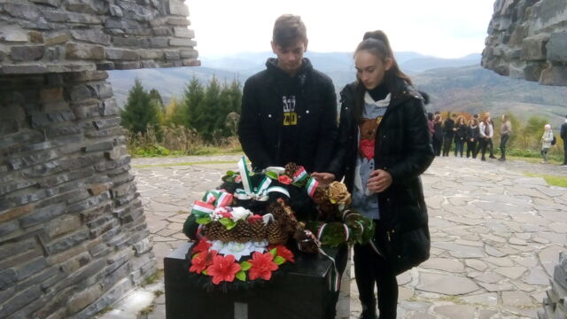 Ezután Kárpátalja a magyarság történetének talán legikonikusabb helyét kerestük fel: a Vereckei-hágón található honfoglalási emlékművet. A gyönyörű kilátás elkápráztatott bennünket. Diáktársaimat nézve, mindenkiben boldog pillanatokat véltem felfedezni: a táj szépségében való elmerengést, a történelmi eseményeken való elgondolkodást, a gyönyörű pillanatokat megörökítő fényképeket. Tanáraink ismertették az itt történt eseményeket, majd közösen elénekeltük nemzeti imánkat. Tiszteletünk jeléül ezen a helyszínen is koszorút helyeztünk el az emlékműnél.