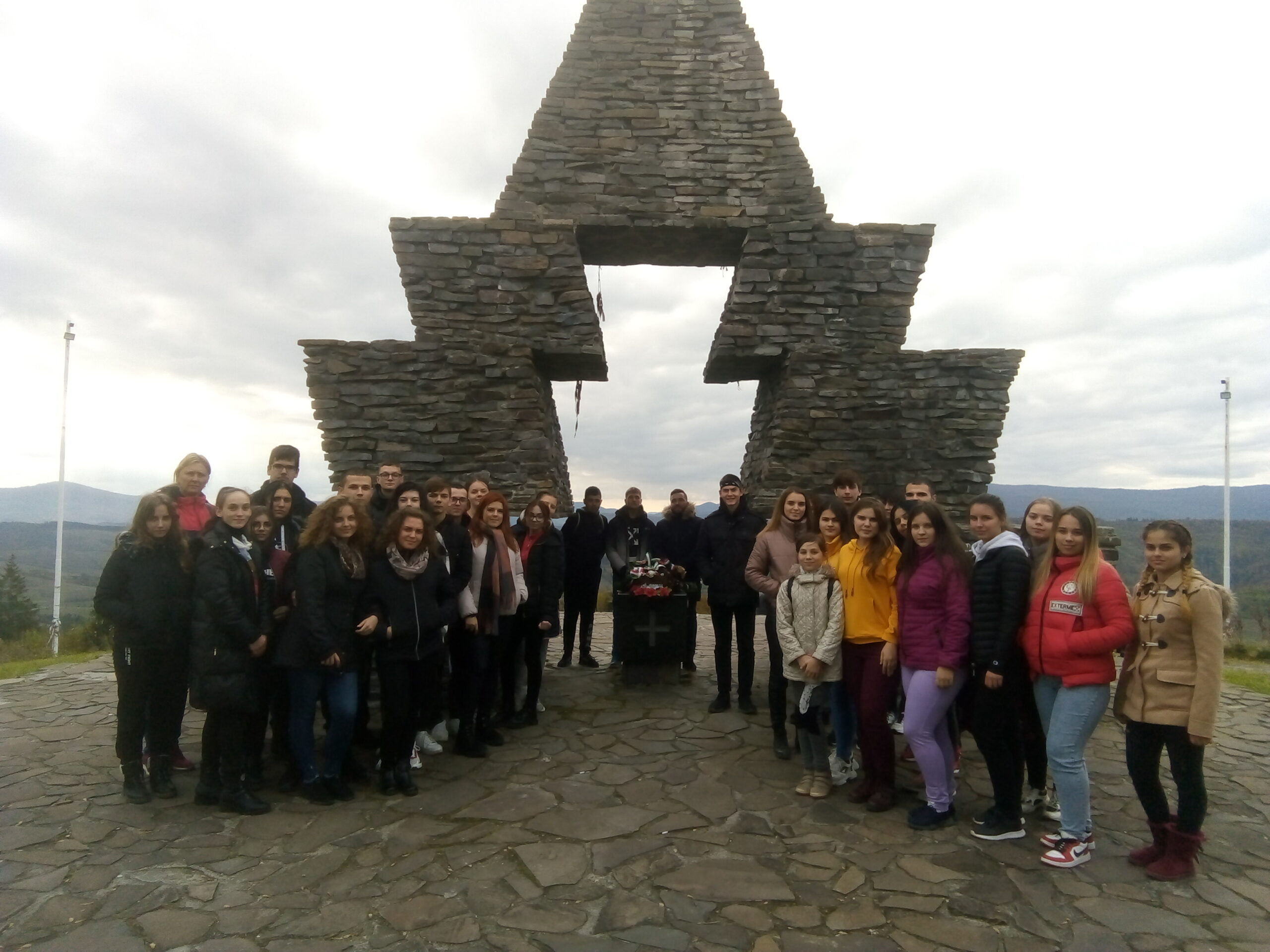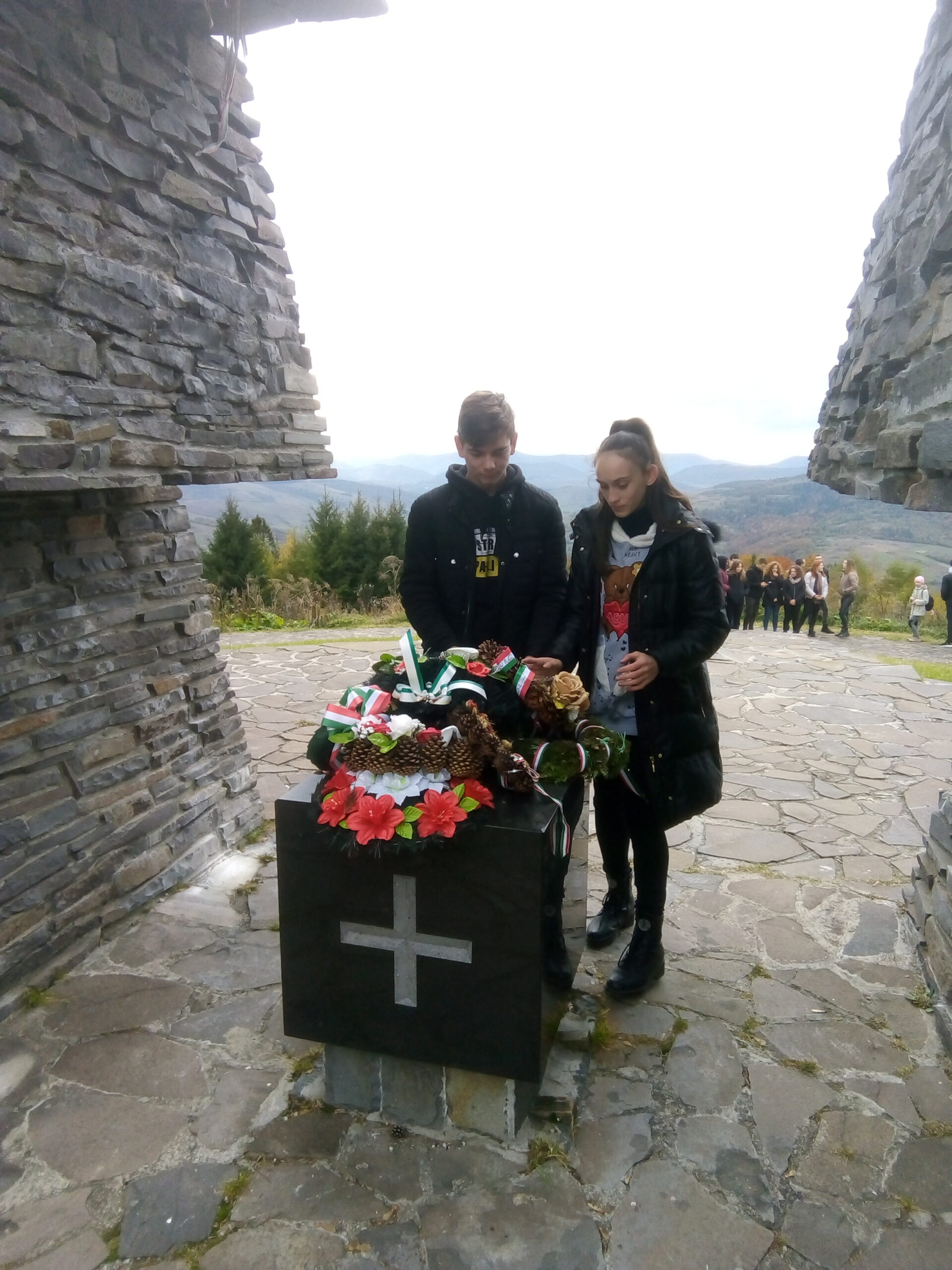 Ezután Kárpátalja a magyarság történetének talán legikonikusabb helyét kerestük fel: a Vereckei-hágón található honfoglalási emlékművet. A gyönyörű kilátás elkápráztatott bennünket. Diáktársaimat nézve, mindenkiben boldog pillanatokat véltem felfedezni: a táj szépségében való elmerengést, a történelmi eseményeken való elgondolkodást, a gyönyörű pillanatokat megörökítő fényképeket. Tanáraink ismertették az itt történt eseményeket, majd közösen elénekeltük nemzeti imánkat. Tiszteletünk jeléül ezen a helyszínen is koszorút helyeztünk el az emlékműnél.