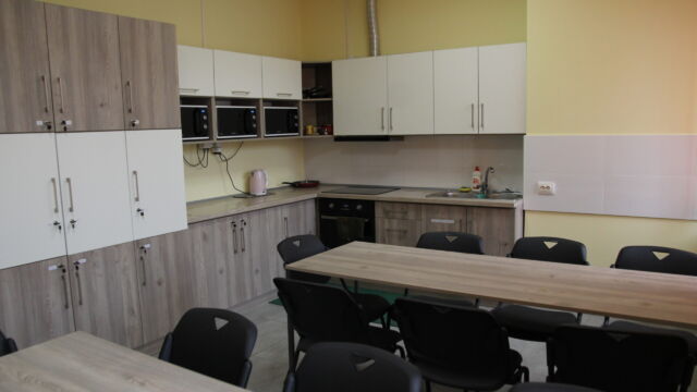 У гуртожитку розміщено 3 кухні-їдальні загальною площею 56,4 м.кв. Кожну кухню-їдальню обладнано шафами для зберігання посуду та меблями для споживання їжі. Для приготування їжі в кухні виділено окрему робочу зону, оснащену сучасною технікою, вмонтовано мийки, витяжний і вентиляційний канали.