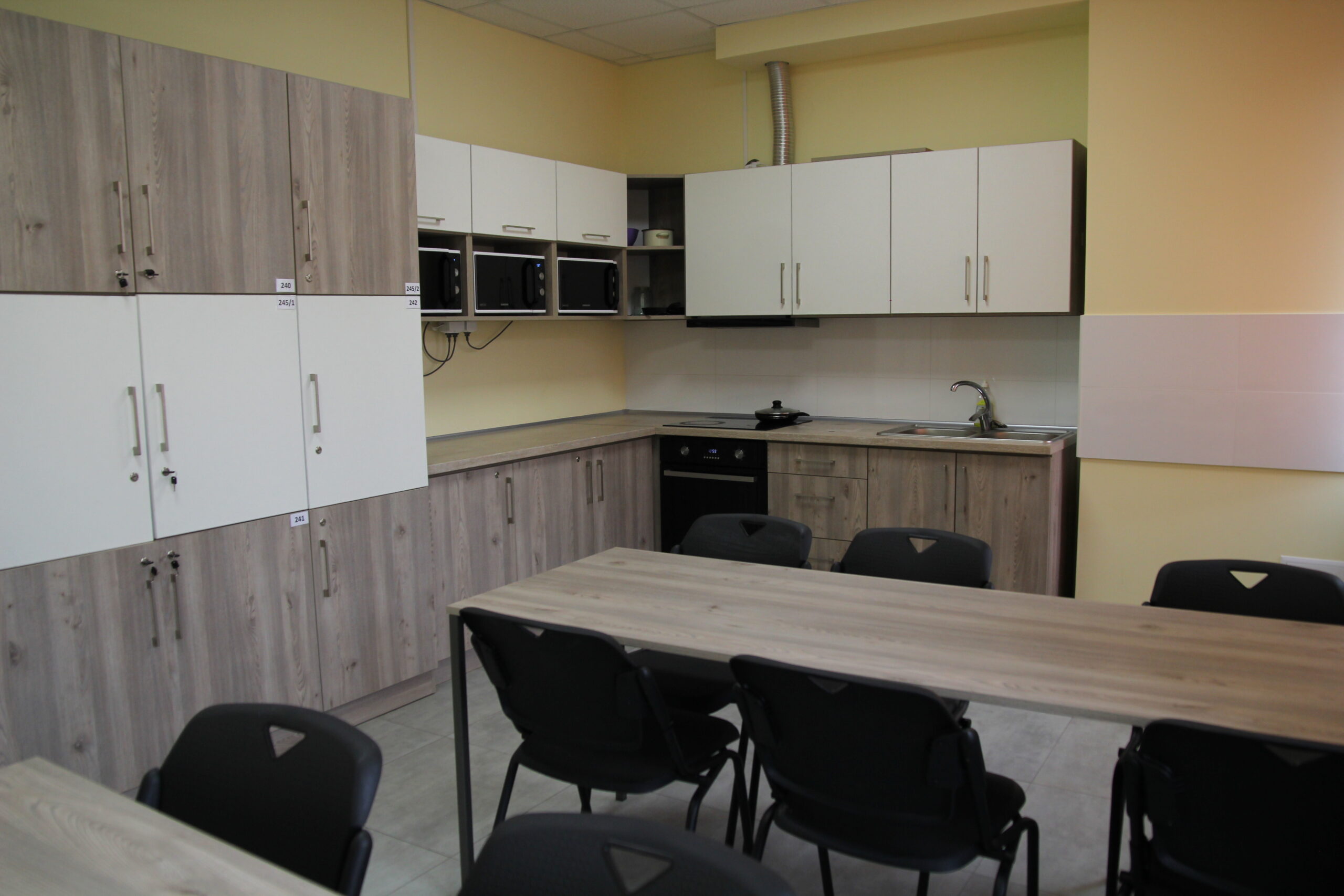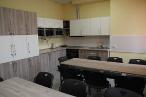 У гуртожитку розміщено 3 кухні-їдальні загальною площею 56,4 м.кв. Кожну кухню-їдальню обладнано шафами для зберігання посуду та меблями для споживання їжі. Для приготування їжі в кухні виділено окрему робочу зону, оснащену сучасною технікою, вмонтовано мийки, витяжний і вентиляційний канали.