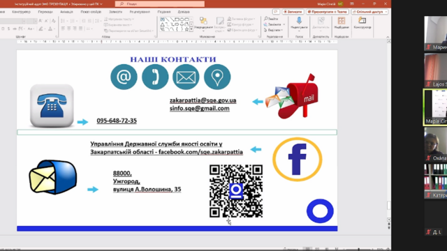Спікер:Марина МАРКО – начальник відділу взаємодії з органами місцевого самоврядування, моніторингу та позапланового контролю закладів освіти управління Державної служби якості освіти у Закарпатській області 15.00-15.30 Питання-відповідь.