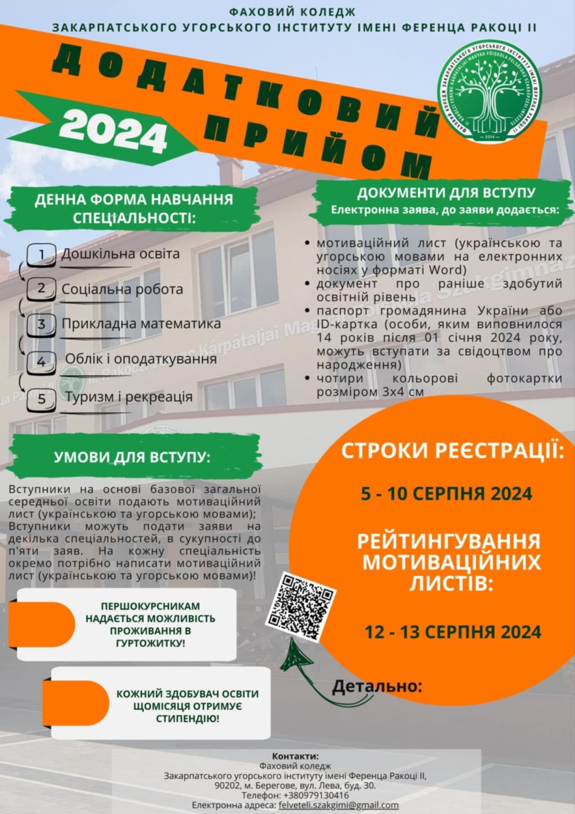 Фаховий коледж Закарпатського угорського інституту імені Ференца Ракоці ІІ оголошує додатковий набір здобувачів фахової передвищої освіти за освітньо-професійним ступенем «Фаховий молодший бакалавр» за наступними спеціальностями: