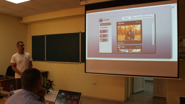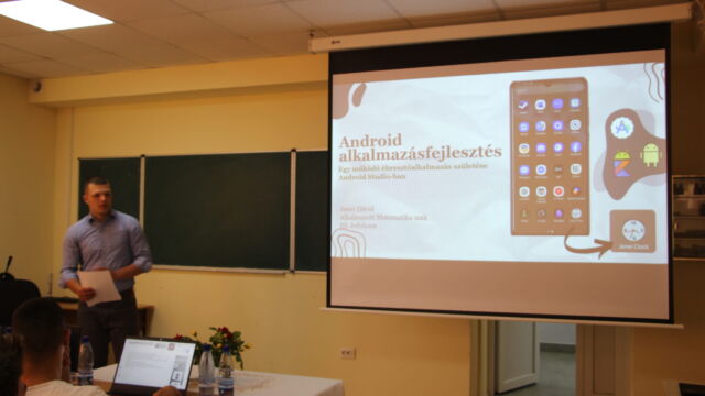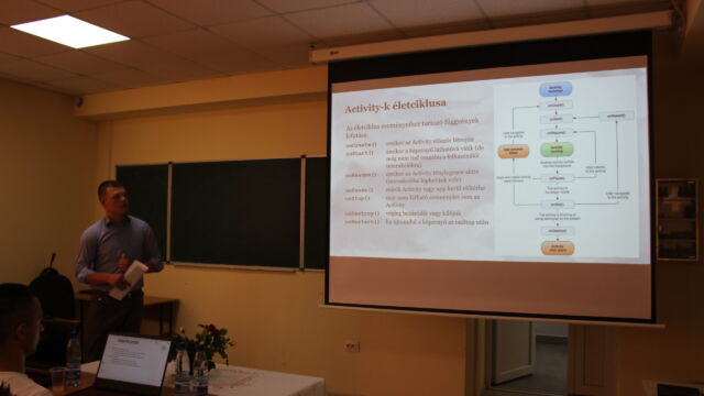 Першим виступив Єней Давід, студент третього курсу, який поділився досвідом розробки Android-додатків. У рамках своєї курсової роботи він створив повноцінний будильник для мобільного пристрою, hj,jne який продемонстрував присутнім.