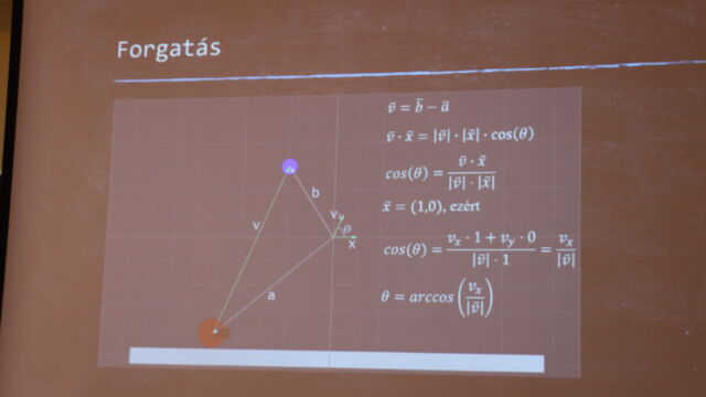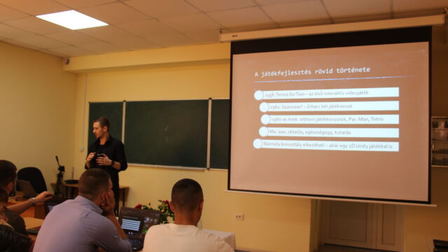 Далі Ковач Давід, цьогорічний випускник, познайомив аудиторію з основами 2D-розробки ігор. Його презентація зосереджувалась на програмуванні руху персонажів у середовищі Unity, а також на математичних принципах, що лежать в основі ігрової механіки. Виступ ґрунтувався на матеріалах його дипломної роботи.